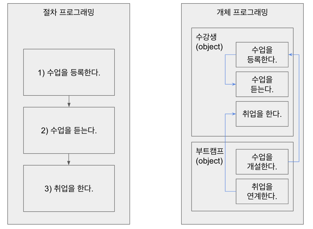 아래 그림처럼 수업을 등록하고 듣고 취업을 하는 절차가 있는 것처럼 위에서부터 순 절차 지향 프로그래밍은 순차적으로 코딩을 하는 것이라고 이해했다. 반면 개체 프로그래밍은 부트캠프라는 것을 설계할 때 그 안에 어떤 요소들이 있는지 파악하고 그 요소(객체)를 정의하고 방식이라고 이해했다.